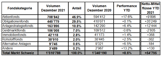 Entwicklung des Fondsmarkts Schweiz (Beträge in Mio. CHF) bis Dezember 2021