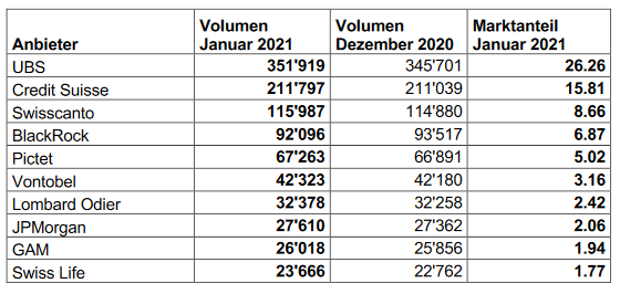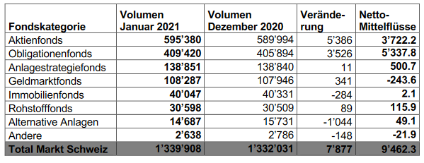 Die Anlegerinnen und Anleger in der Schweiz vertrauten der Fondsindustrie im Januar 2021 1’339’908 Mio. CHF (DezemberB2020: 1’332’031 Mio. CHF) an. „Im Berichtsmonat war an den Finanzmärkten ein leichter Rückgang zu verzeichnen.