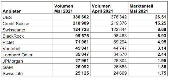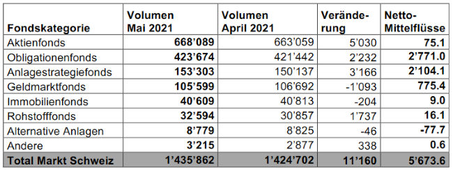 Die Anlegerinnen und Anleger in der Schweiz vertrauten der Fondsindustrie im Mai20211’435’862Mio. CHF (April2021: 1’424’702Mio. CHF) an.