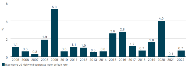 Lediglich in der Finanzkrise stiegen die Ausfallraten in den USA auf mehr als fünf Prozent. 2021 waren die Ausfallraten so niedrig wie seit 15 Jahren nicht mehr und 2022 wurde ein Anstieg auf 0,7 Prozent verzeichnet, obwohl die Rezessionsrisiken bereits zunahmen. Unter der Annahme konservativer Erholungsraten von rund 35 Prozent preisen die Kreditspreads für Hochzinsanleihen eine Überkompensation für die Ausfallrisiken ein.
