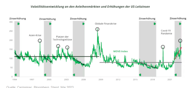 Die Volatilität der US-Zinsen war in den in den letzten zwölf Monaten ausgesprochen hoch. Der MOVE-Index erreichte ein Niveau, das mit historischen Krisenzeiten in Verbindung gebracht wird wie beispielsweise die Asien-Krise, das Platzen der Internet-Blase, die Weltfinanzkrise 2008 und die COVID-Pandemie (siehe schwarze Kreise in der Grafik).