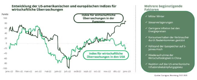Carmignac : Im Vergleich zu den USA hat Europa hat in den vergangenen Wochen eine starke wirtschaftliche Entwicklung gezeigt, wie an den Indikatoren für wirtschaftliche Überraschungen der beiden Regionen jeweils abzulesen ist.