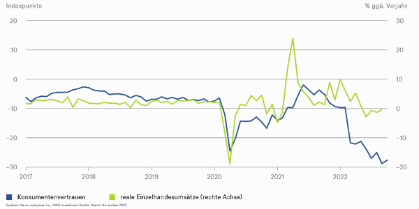 Auf der Nachfrageseite wiederum wurde das Wachstum des Bruttoinlandsprodukts (BIP) im dritten Quartal trotz schlechter Stimmungsindikatoren und hoher Inflation vom Konsum getrieben. Wir sehen dafür fünf wesentliche Gründe: 1. Die Löhne und Gehälter steigen weiter. 2. Die Beschäftigung steigt weiter und dürfte aufgrund des Fachkräftemangels auch bei schwachem Wachstum nur wenig zurückgehen. 3. Acht Prozent Inflation sind nicht gleichbedeutend mit acht Prozent weniger Kaufkraft, da die Menschen ihren Konsum anpassen (siehe etwa rückläufiger Gasverbrauch). 4. Der Staat greift dem Verbraucher erneut mit üppigen Stützungspaketen unter die Arme – EU-weit entsprechen die Hilfen rund 3,5 Prozent des BIPs. Damit dürften 5. den Verbrauchern im kommenden Jahr real gar nicht so viel weniger Mittel zur Verfügung haben als dieses Jahr.