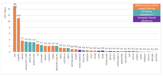 Derzeit hat Novo Nordisk, die grösste GRANOLA-Aktie, den gleichen Marktwert wie Tesla, die kleinste der „Magnificent Seven“. Auch wenn wir die Größe dieser Unternehmen nicht herunterspielen wollen – schliesslich ist die Aktie von Novo Nordisk derzeit mehr wert als das BIP seines Heimatmarktes Dänemark im Jahr 2023 – verdeutlicht dieser Vergleich den Größenunterschied zwischen europäischen und US-amerikanischen Mega-Caps. In einem nach der globalen Marktkapitalisierung gewichteten Aktienportfolio entspricht dies einer Allokation von weniger als 5 % GRANOLAS gegenüber etwa 25 % Magnificent Seven.