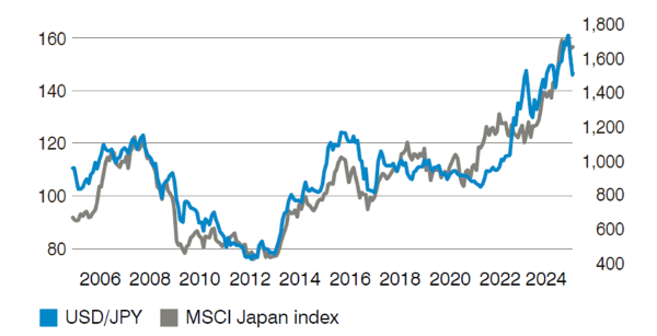 Abbildung 1: USD/JPY gegenüber MSCI Japan Index (vom 3. September 2004 bis 2. September 2024)