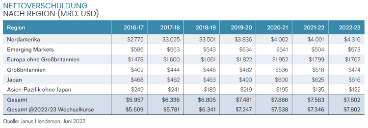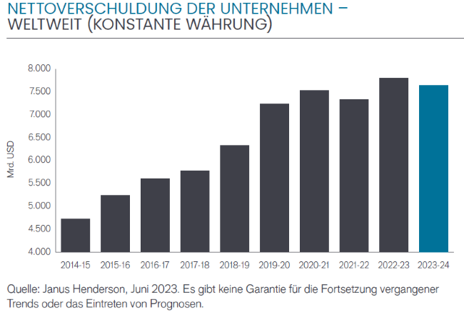 Laut dem aktuellen Janus Henderson Corporate Debt Index[1] nahmen Unternehmen 2022/23 Netto-Neuverschuldungen in Höhe von 456 Mrd. US-Dollar[2] auf, was den Gesamtschuldenstand bei konstanten Wechselkursen um 6,2 % auf einen Rekordwert von 7,80 Billionen US-Dollar ansteigen liess. Unter Berücksichtigung der Wechselkursschwankungen wurde damit der Höchststand von 2020 überschritten.