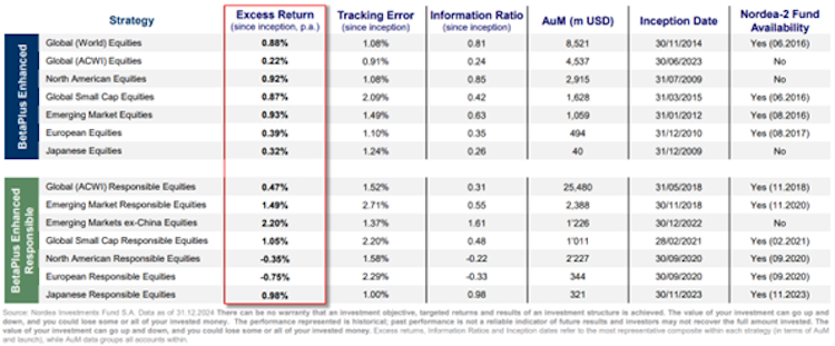 Nordea BetaPlus wurde bereits 2009 lanciert. Die Produktlinie ist eine Antwort auf passives Anlegen und bietet das Beste aus der Welt der passiven und der aktiven Anlagen. Im Unterschied zu klassischen Indexfonds bilden BetaPlus-Strategien nicht nur eins zu eins einen Vergleichsindex ab, sondern haben zum Ziel, eine Überrendite und damit Mehrwert für die Anleger zu erzielen. Gleichzeitig wird das aktive Risiko durch den angestrebten Tracking Error von 1 Prozent2 tief gehalten.