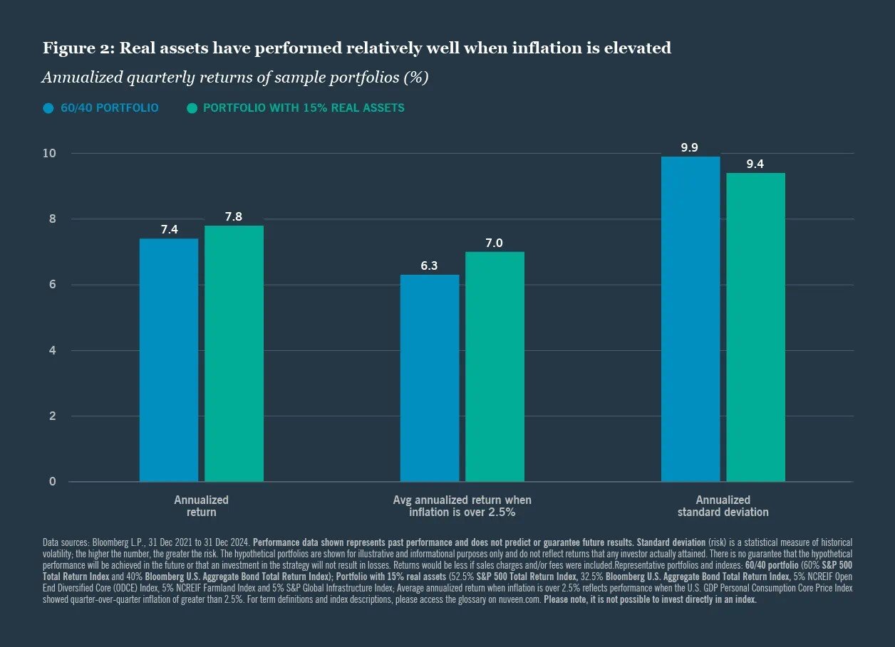 Angesichts der hartnäckigen Inflation und neuer wirtschaftlicher Unsicherheiten stellt sich die Frage, welche Anlageklassen Schutz bieten können. Während Gold als traditioneller Inflationsschutz betrachtet wird, zeigen sich in der Praxis Sachwerte wie Immobilien, Infrastruktur und Rohstoffe oft effektiver. Die untenstehende Grafik zeigt, dass ein Portfolio mit einer Allokation von 15 Prozent in Sachwerte im Vergleich zu einem traditionellen 60/40-Portfolio höhere Renditen bei leicht reduzierter Volatilität erzielt, insbesondere in Phasen erhöhter Inflation.