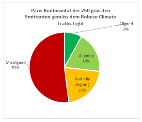 Wir weisen allerdings darauf hin, dass solche Daten nur ein unvollständiges Bild zeichnen. Die Dekarbonisierung des Portfolios kann sich daraus ergeben, dass ein einzelner Emittent oder einige wenige in die Portfolios aufgenommen oder aus ihnen herausgenommen wurden. Genauso wichtig ist es, die Unternehmen selbst zu betrachten und zu untersuchen, wie gut sie ihren Wandel bewältigen. Gemessen wird dies mittels unserer Klima-Ampel. Sie zeigt an, wie gut sich die 250 grössten Emittenten im Anlageuniversum auf die Ziele des Pariser Klimaabkommens einstellen.