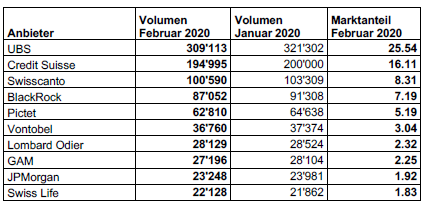 „Aufgrund der durch die Corona- Krise verursachten Verunsicherung an den Finanzmärkten notierten alle relevanten Aktienbörsen im Berichtsmonat im Minus, entsprechend sank das Volumen des Schweizer Fondsmarktes. Per Saldo wurden im Februar 2020 noch leicht mehr Gelder in Fonds investiert als abgezogen. Am meisten Mittelzuflüsse verzeichneten die Obligationenfonds, während aus den Aktienfonds fast die gleiche Summe abgezogen wurde“, erklärte Markus Fuchs, Geschäftsführer der Swiss Funds & Asset Management Association SFAMA.