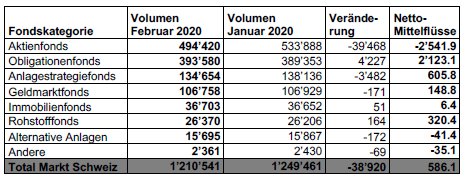 Die Nettomittelzuflüsse betrugen im Februar 2020 586.1 Mio. CHF. An der Spitze lagen dabei Obligationenfonds (2.1 Mrd. CHF), mit grossem Abstand folgten Anlagestrategiefonds (605.8 Mio. CHF) und Rohstofffonds (320.4 Mio. CHF).
