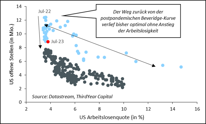 Aktieninvestoren haben dieses Jahr am US-Arbeitsmarkt von einem nahezu optimalen Szenario profitiert: Bei der Inflationsbekämpfung und einer gewünschten Abkühlung der Wirtschaft muss die Politik in den meisten Fällen einen Anstieg der Arbeitslosigkeit in Kauf nehmen. Anders in den USA: Die Beveridge-Kurve visualisiert, dass es in diesem Zyklus bisher möglich war, eine signifikante Abkühlung des Arbeitsmarktes – gemessen an den offenen Stellen – bei einer nahezu unverändert niedrigen Arbeitslosenquote zu erreichen. Selbst bei einer ex-ante Modellierung der Kurve hätte man von diesem Szenario, in dem die postpandemischen Datenpunkte (blau) exakt am linken Rand in die alte Welt (grau) nach unten driften, nicht zwingend ausgehen können. Selbst der marginale Anstieg der Arbeitslosenquote im jüngsten Arbeitsmarktbericht war kein Anzeichen zyklischen Risikos, sondern auf eine steigende Partizipation zurückzuführen. Das bedeutet, dass die realen Arbeitseinkommen und somit die gesamtwirtschaftliche Nachfrage vorerst hoch bleibt.