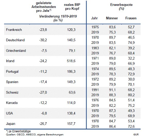 Die Antwort ist ein klares Ja, aber nicht in dem Maße, wie Keynes es sich vorgestellt hat. Alte Gewohnheiten lassen sich nicht so leicht abschütteln, der Wunsch nach immer mehr Konsumgütern ist nach wie vor stark, nach zusätzlichen und größeren Autos, nach zusätzlichen und größeren Wohnungen und einem aufwendigen Lebensstil. Man will die Nachbarn beeindrucken – keep up with the Joneses! Es geht daher nur langsam voran mit der Zunahme der Freizeit. In Deutschland ist die Jahresarbeitszeit eines durchschnittlichen Erwerbstätigen in den vergangenen 50 Jahren immerhin um etwa 30 Prozent zurück-gegangen, in Japan um 27 Prozent, in Frankreich um 24 Prozent. Keynes hatte eher einen Rückgang um 70 Prozent erwartet. Die Zahlen sollten allerdings nicht zum Nennwert genommen werden: Sie sind nicht so positiv, wie sie auf den ersten Blick erscheinen: Zu einem großen Teil reflektieren sie die Tatsache, dass sich immer mehr Frauen in den vergangenen Jahrzehnten am Erwerbsleben beteiligt haben – und die haben aus nachvollziehbaren Gründen eine Vorliebe für Teilzeitjobs. So groß ist also der tatsächliche Fortschritt selbst in Deutschland oder Japan nicht.