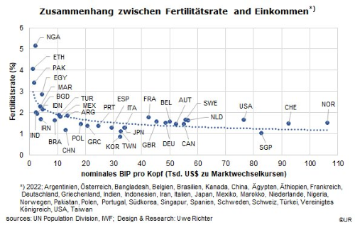 Der Club of Rome hatte 1972 in seinem Bericht über die Grenzen des Wachstums unter anderem den naheliegenden Vorschlag gemacht, das Bevölkerungswachstum zu bremsen, etwa indem jeder Frau, die in ihrem Leben nur ein Kind zur Welt bringt, eine attraktive Geldprämie gezahlt wird. Weniger Menschen, weniger Ressourcenverbrauch, eine bessere Umwelt. Es dürfte aber auch ohne solch drastische Maßnahmen bei der Weltbevölkerung in den nächsten Jahrzehnten zu einer Trendwende kommen, vor allem weil die Anzahl der Geburten negativ korreliert ist mit dem Pro-Kopf-Einkommen – das aller Voraussicht global weiter kräftig zunimmt (wenn auch nur im Durchschnitt).